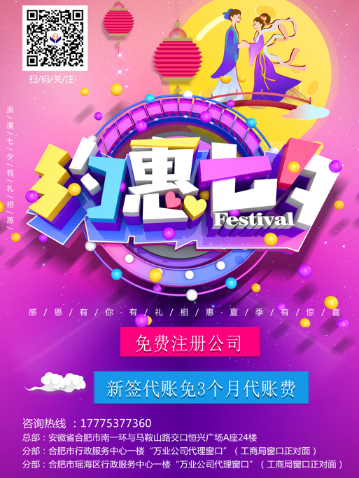七夕情人節(jié) 七夕節(jié),又名乞巧節(jié)、七巧節(jié)或七姐誕,發(fā)源于中國,是華人地區(qū)以及東亞各國的傳統(tǒng)節(jié)日,該節(jié)日來自于牛郎與織女的傳說,七夕現(xiàn)已成為中國情人節(jié)。 一年一度的七夕情人節(jié)(虐汪日)又到了 安徽萬業(yè)祝全天下有情人 終成眷屬 在這樣特殊的日子里 怎么少得了優(yōu)惠活動呢? 安徽萬業(yè)特此推出優(yōu)惠大派送 快來圍觀!! 一大波送禮高潮正在趕來 01 免費注冊公司 02 新簽代賬免3個月代賬費 如此優(yōu)惠的活動還不趕緊行動起來! 選擇萬業(yè)幫您輕松創(chuàng)業(yè),省心、省力、省時、贏在起跑線,成功快一步!同時簽約成功者還可以免費介紹男女朋友喔