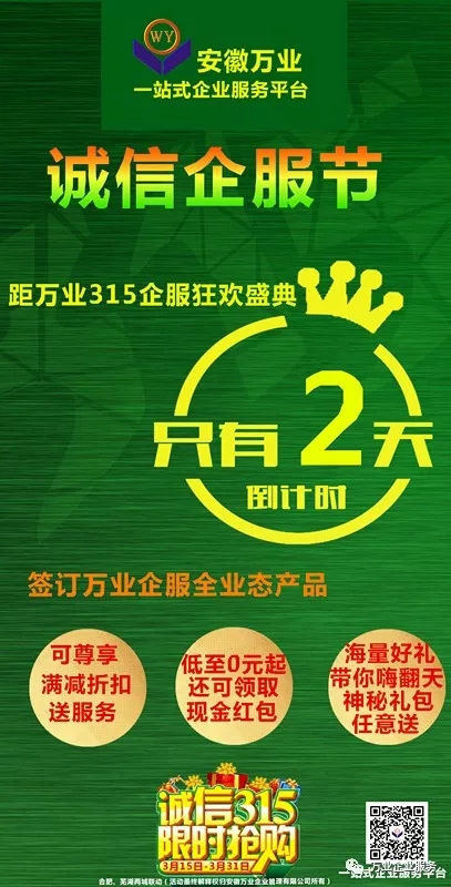 315來源 315即國際消費(fèi)者權(quán)益日,定于每年的3月15日,因?yàn)樵?962年的3月15日時(shí)任美國總統(tǒng)的約翰·肯尼迪在美國國會發(fā)表《關(guān)于保護(hù)消費(fèi)者利益的總統(tǒng)特別咨文》一文,文中首次提出了著名的消費(fèi)者四項(xiàng)權(quán)利。最早由國際消費(fèi)者聯(lián)盟組織于1983年確定,目的在于擴(kuò)大消費(fèi)者權(quán)益保護(hù)的宣傳,使之在世界范圍內(nèi)得到重視,促進(jìn)各國和地區(qū)消費(fèi)者組織之間的合作與交往,在國際范圍內(nèi)更好地保護(hù)消費(fèi)者權(quán)益。 現(xiàn)為了響應(yīng)315誠信服務(wù)消費(fèi)者的號召,安徽萬業(yè)特推出315企服節(jié)盛典活動。 距315企服節(jié)盛典還有2天 誠信企服節(jié) 即將到來! 重磅驚喜 萬業(yè)公司“3.15誠信企服節(jié)”重磅推出:刻章0元,代賬即返現(xiàn),商標(biāo)8折,資質(zhì)送3A,萬元神秘大禮+抽獎活動! 驚喜不 安徽萬業(yè)315企服節(jié)盛典即將到來,活動中驚喜不斷!您還在等什么?合肥、蕪湖兩城聯(lián)動,嗨翻購! 企業(yè)一站式服務(wù)平臺 工商注冊、財(cái)稅代賬、審計(jì)評估、財(cái)務(wù)咨詢、商標(biāo)專利、資質(zhì)審批、人才獵頭、人才報(bào)名、金融保險(xiǎn)、信用評級、法務(wù)咨詢、項(xiàng)目申報(bào) 公司網(wǎng)站:m.re-studio.com.cn 聯(lián)系方式:400-0551-976 合肥總部:安徽省合肥市南一環(huán)與馬鞍山路交口恒興廣場A座24樓 分部:合肥市行政服務(wù)中心一樓“萬業(yè)公司代理窗口”(工商局窗口正對面) 分部:合肥市瑤海區(qū)行政服務(wù)中心一樓“萬業(yè)公司代理窗口”(工商局窗口正對面) 蕪湖分部:蕪湖市鏡湖區(qū)偉星時(shí)代金融中心610室 (申經(jīng)理:189-0560-8966)